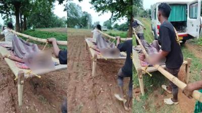 सड़क न होने से खटिया पर ले जाई गई प्रसव पीड़ित महिला