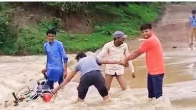 तेज बहाव में बाइक सहित फंसे बुजुर्ग, बेटा-बहू; समय रहते बचाई गई जान