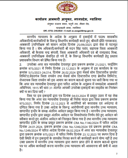ग्वालियर। नकली शराब परिवहन परमिट और अवैध शराब की आपूर्ति से जुड़े गंभीर आपराधिक मामले में आबकारी आयुक्त, मध्यप्रदेश ने बड़ा प्रशासनिक कदम उठाया है। अपर सत्र न्यायाधीश देपालपुर द्वारा दोष सिद्ध होने के बाद सोम डिस्टलरीज प्रायवेट लिमिटेड, सेहतगंज (रायसेन) एवं सोम डिस्टलरीज एंड ब्रेवरीज लिमिटेड, रोजराचक (रायसेन) के सभी प्रमुख आबकारी लाइसेंस तत्काल प्रभाव से निलंबित कर दिए गए हैं।