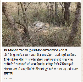 श्योपुर। अत्यंत हर्ष का विषय है कि प्रोजेक्ट चीता के अंतर्गत दक्षिण अफ्रीका से आई मादा चीता ‘गामिनी’ ने 3 शावकों को जन्म दिया है। श्योपुर जिले में स्थित कूनो नेशनल पार्क में आए चीतों के तीन वर्ष पूर्ण होने के साथ यह 9वां सफल प्रसव है। भारत में चीतों की कुल संख्या बढ़कर अब 38 हो गई है। यह पूरे देश के लिए वन्यजीव संरक्षण, जैव विविधता और पर्यावरण संतुलन की दिशा में ऐतिहासिक उपलब्धि है।