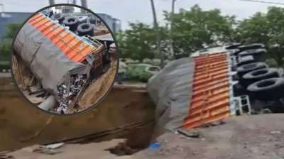 पेरीफेरल एक्सप्रेसवे पर धंसी सड़क, पलटा बीयर से भरा ट्रक