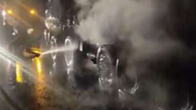 चलते ट्रक का टायर फटा, देखते ही देखते आग की लपटों में घिरा वाहन